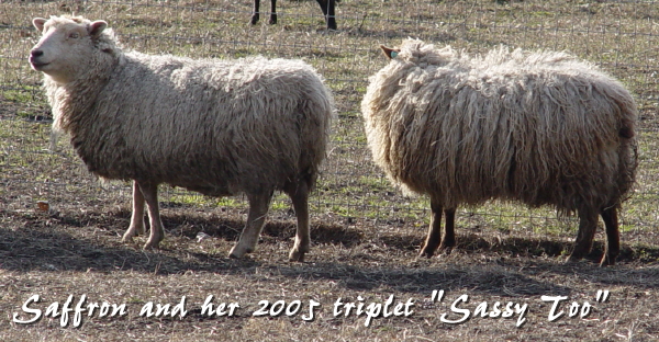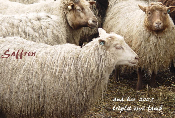 We purchased Saffron mainly for her silky long "stark white" fleece. Last year we bred her to Gimli, and she gave us triplets, including the cutest ewe lamb of the year,